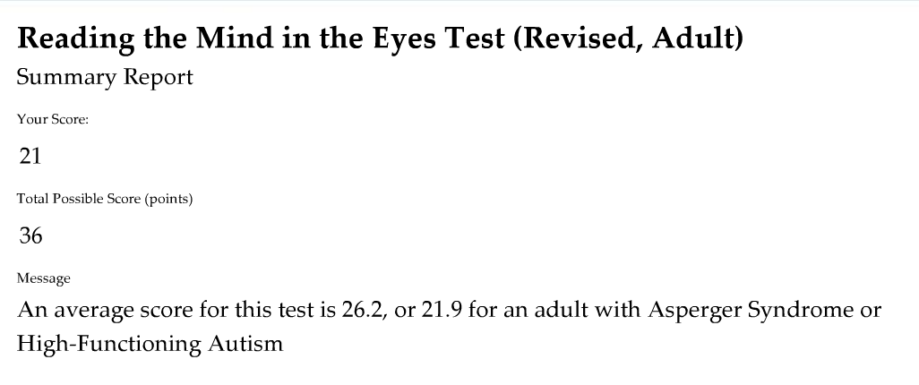 Про тест RME: во-первых, он уже существует на русском языке http://www.aspergers.ru/node/232. Во-вторых, результат 21 балл как раз близок к среднему для обладателей синдрома Аспергера. Ибо правильный перевод предложения про интерпретацию результатов примерно такой: "Средний балл - 26.9, а у взрослых с синдромом Аспергера/высокофункциональным аутизмом - 21.9". Т.е. тут два диагноза используются как синонимы.