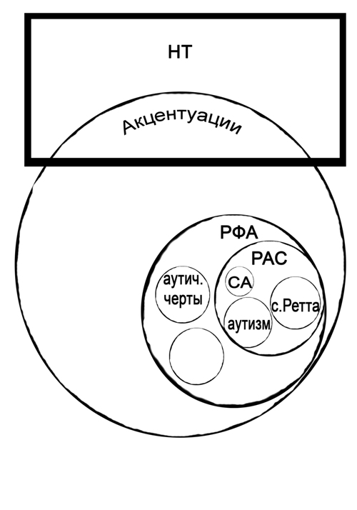 Попробовала нарисовать.РАС - часть РФА, который в свою очередь можно признать частью массива "акцентуации личности", который в свою очередь часть массива "нейроразнообразие человечества" (по аналогии с биологической систематикой).