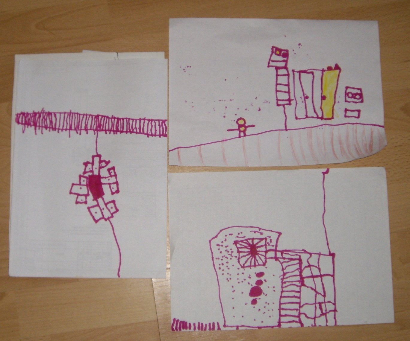 Что рисуют Ваши дети? Моя дочка может нарисовать что-то понятное под моим руководством, повторяя за мной шаг за шагом простой рисунок. Сама если рисует, получается что-то малопонятное, иногда она объясняет, например, говорит "Это лабиринт", иногда говорит, что это, которое это там, и оно опускается здесь и получается так, в общем, я имею в виду малопонятное объяснение, с которым я просто соглашаюсь. И у нее есть какие-то мотивы, которые повторяются из раза в раз, раньше это были круги, снежинки, солнца, потом стали точки, стрелки, цветочки, листочки, лестницы, очень много однотипных мелочей. Недавно удивила меня тем, как украсила бумажный самолет: нарисовала на нем листочки в ряды по краям, очень много мелких, я посчитала с одного краю - 50 штук. Вот пример ее самостоятельных рисунков: Там есть шкаф и кровать с лестницей и подушками - это довольно-таки разборчиво. А точки и кружочки на нижнем рисунке - это, как она говорила, люди.